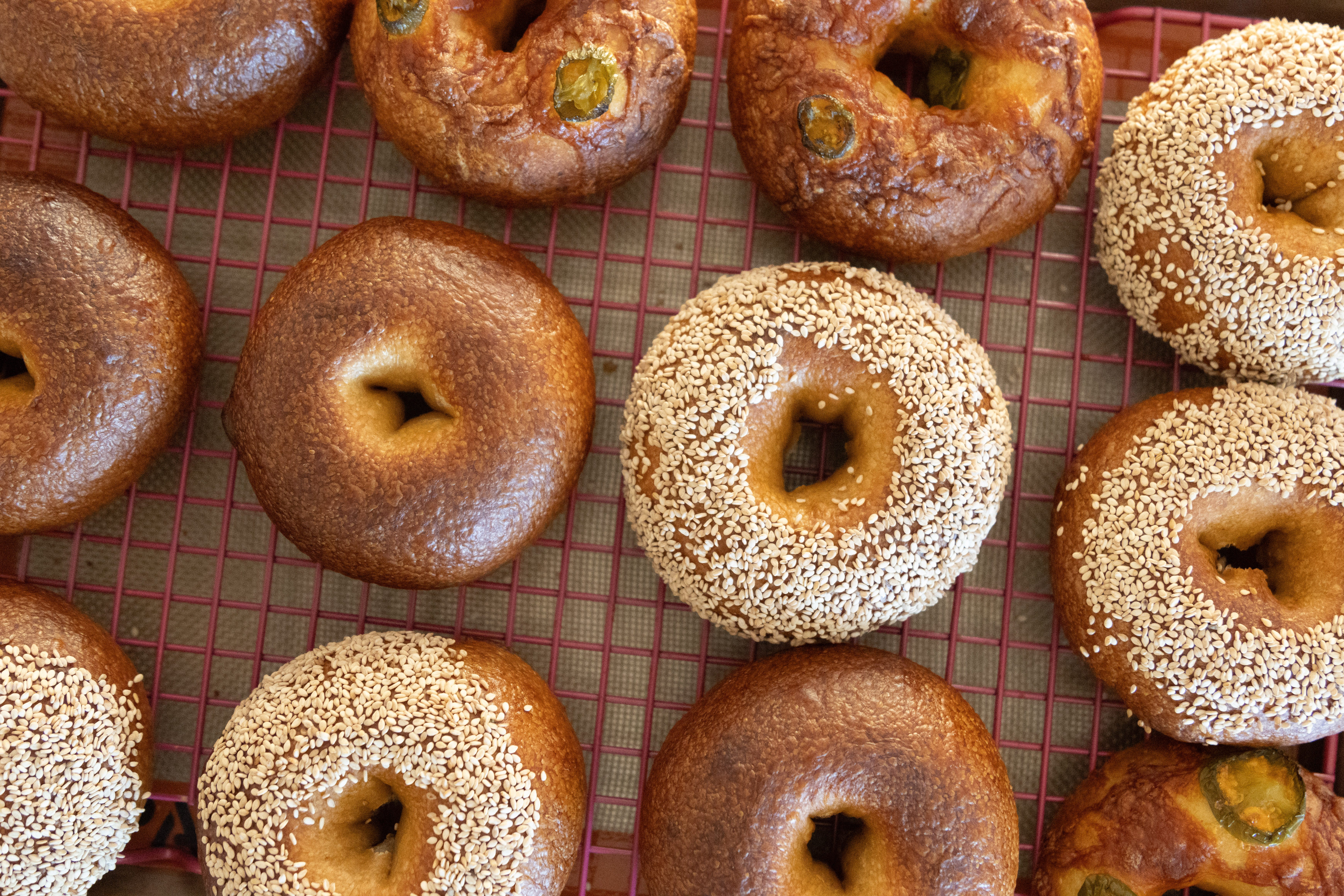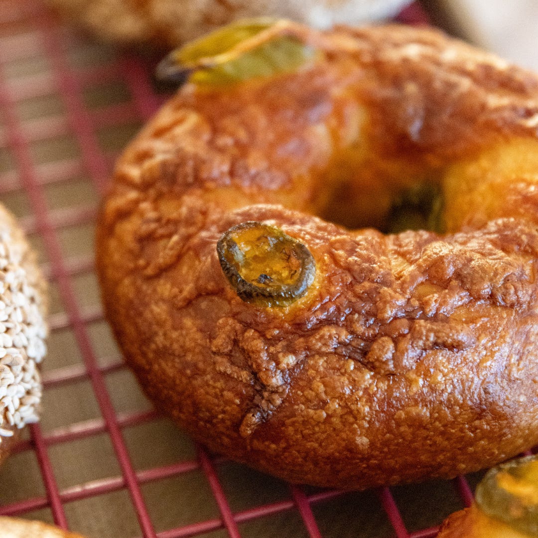 Add enough malt syrup in a large pot of water to make it look like dark tea. Add the sodium carbonate and bring the mixture to a boil. Take your bagels and boil them for 30 seconds on each side, placing them on a wire rack. Drain the bagels for 10 seconds. If you’re adding toppings, dip the tops and sides of the bagels into sesame seeds or place the bagels on the baking trays and top with cheddar cheese and jalapenos.